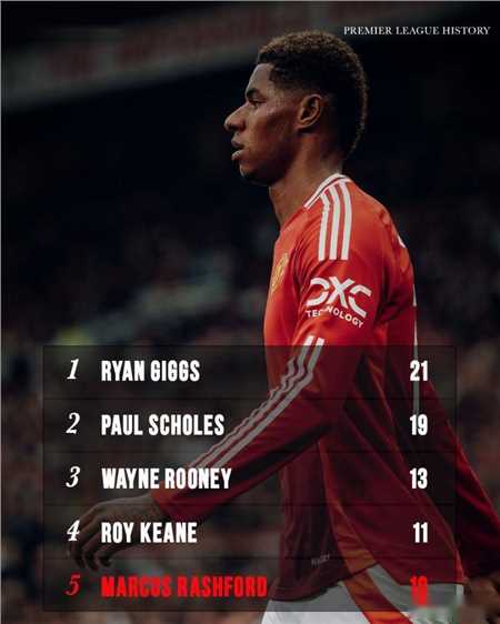2024-25赛季,拉什福德在对阵南安普顿的比赛中斩获个人本赛季英超首球,成为曼联队史第五位在10个不同英超赛季进球的球员。
